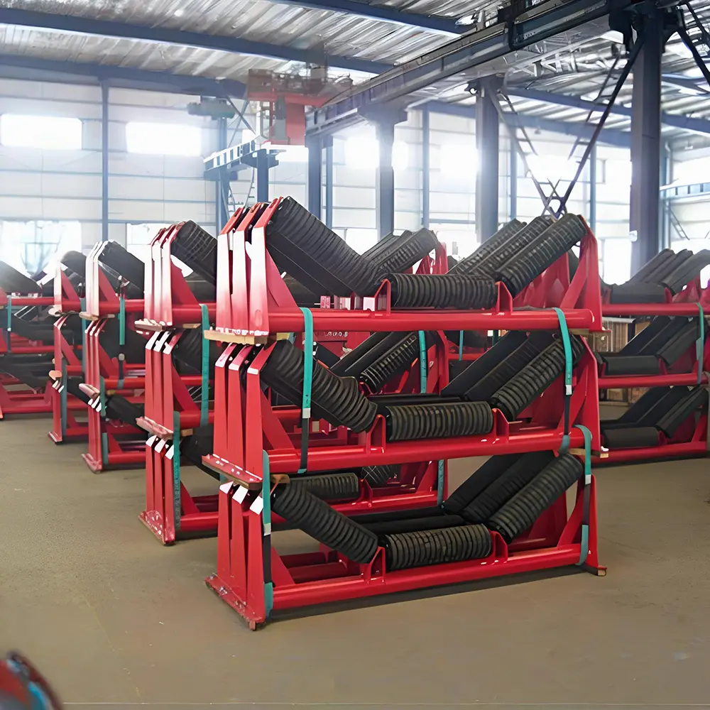 槽型托辊组是最常见的承载类型托辊组,通常设计有3或5个托辊,安装在输送带的承载侧。槽托辊通过提供更均匀的承载能力,确保输送带在长度方向的稳定性,从而防止物料在装载点的掉落。