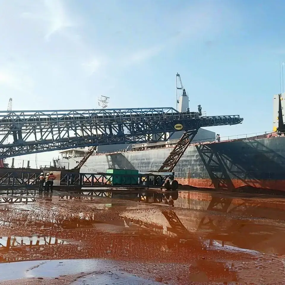 矿石码头作为散料出口的关键节点,矿石等物料密度通常达 2.5-3.0t/m³,对设备结构强度和输送部件耐磨性要求较为严苛,同时需适配 35000-50000DWT 大灵便型船的舱口高度(6-10m)与宽度变化。ZRSL-45 移动装船机采用 Q355ND 高强度耐候钢打造机身框架,配合 ST/S800 型强力输送带(抗拉强度 800N/mm)形成高耐磨输送体系,可有效抵抗矿石长期冲击导致的结构变形与皮带损耗。